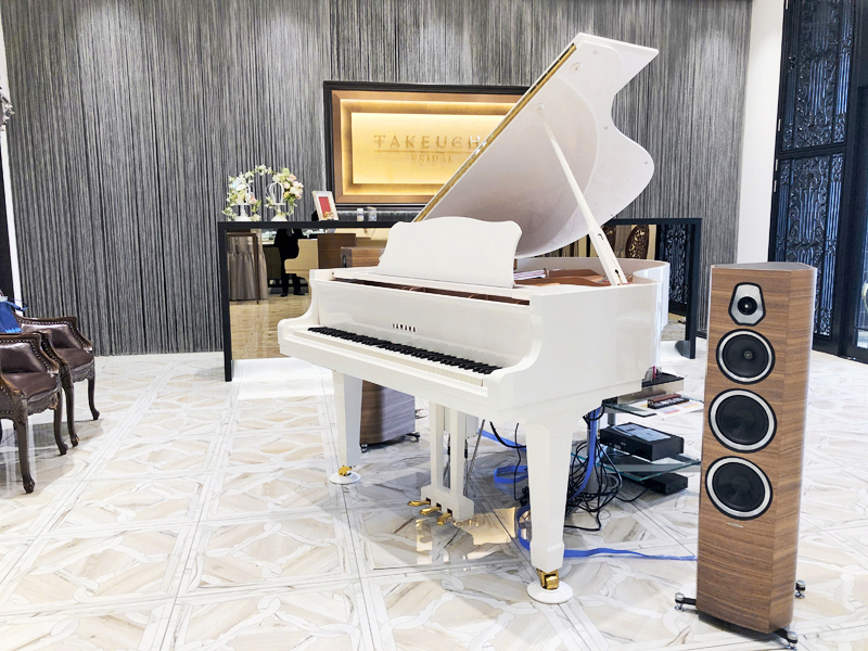 希少な白いグランドピアノ。ヤマハグランドピアノC5L白色艶出し仕上げ。2002年製。ニューアイボリー(人工象牙)と黒檀調天然木鍵盤。奥行200cm。